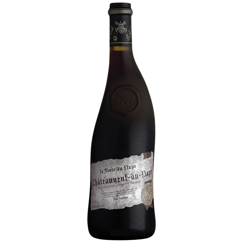 This wine under Père Anselme signature, was created in 1952 by Charles Brotte with the co-operation of local Provençale glass and ceramic craftsmen. The original and surprising bottle shape represents the gnarled and twisted vines typical of the region due to their struggle of growing against the Mistral wind. La Fiole, “Phiala” in latin refers to a “precious bottle”. The bottle is exclusive as Père Anselme is the only winery permitted to use this shape. “Pape” evokes the cru of Châteauneuf-du-Pape as well as the presence of the Popes in the region and village in the Middle Ages. The bottle’s golden anthracite grey powder recalls wines of former times.
